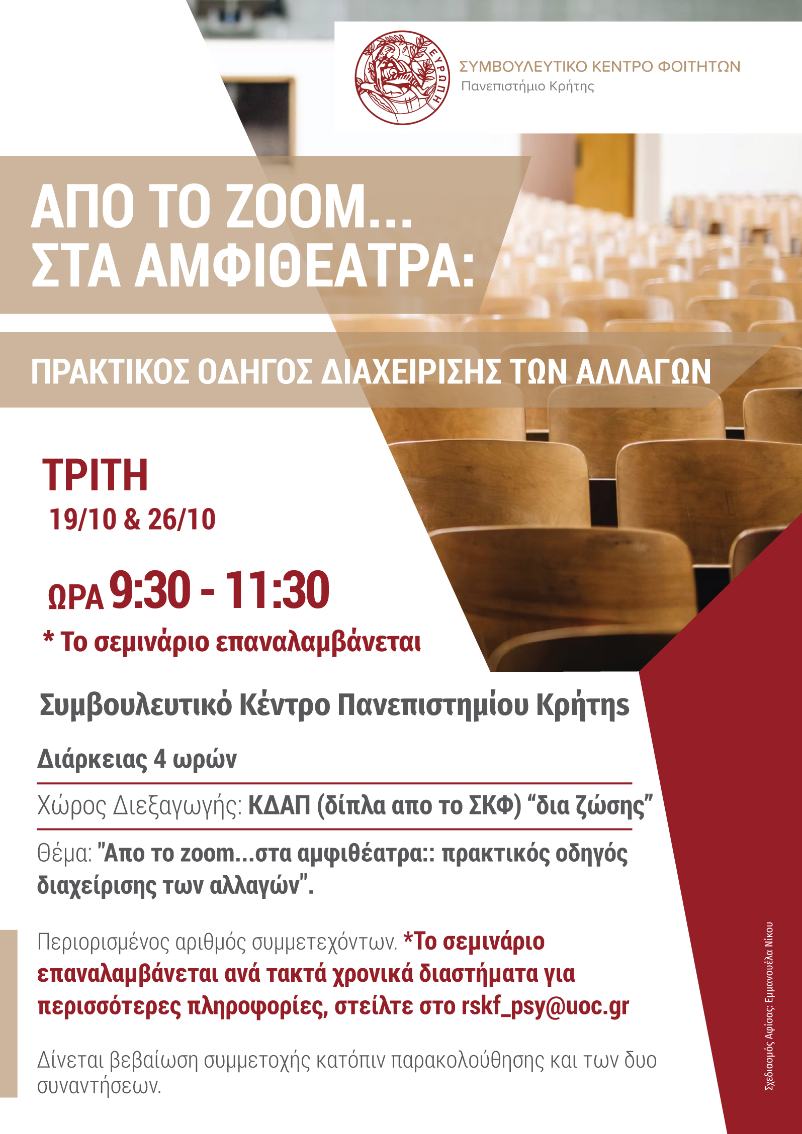 "Βιωματικό Σεμινάριο του ΣΚΦ με τίτλο: "Από το zoom...στα αμφιθέατρα: Πρακτικός οδηγός διαχείρισης των αλλαγών".